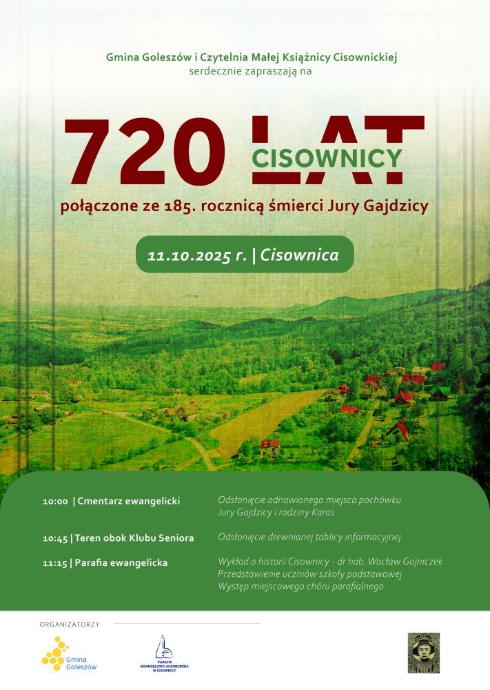 Wójt Gminy Goleszów Sylwia Cieślar, Gmina Goleszów oraz Czytelnia Małej Książnicy Cisownickiej zapraszają na uroczystości 720-lecia Cisownicy połączone z 185. rocznicą śmierci Jury Gajdzicy, które odbędą się w sobotę, 11 października.