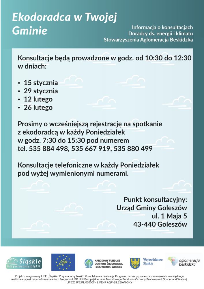 W styczniu i lutym kontynuowane będą spotkania konsultacyjne z doradcą ds. energii i klimatu Stowarzyszenia Aglomeracji Beskidzkiej, który pełnić będzie dyżury w siedzibie Urzędu Gminy w Goleszowie.