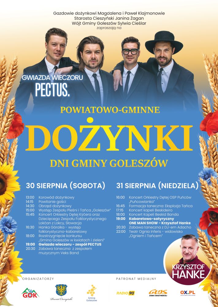 Dwa dni muzyki, tradycji i świetnej zabawy! Już 30 i 31 sierpnia Gmina Goleszów zaprasza na wyjątkowe Powiatowo-Gminne Dożynki i Dni Gminy Goleszów, podczas których spotkają się barwny folklor, znakomita muzyka i wspaniała atmosfera wspólnego świętowania. W sobotę zaplanowano korowód dożynkowy, występy lokalnych i zagranicznych zespołów oraz ogłoszenie wyników konkursu „Gmina Goleszów w kwiatach i zieleni”, a wieczorem koncerty, w tym występ gwiazdy wieczoru. Niedziela upłynie pod znakiem koncertów orkiestr i kapel, pokazów tanecznych, kabaretu Krzysztofa Hanke oraz widowiska Teatru Ognia InFeris.