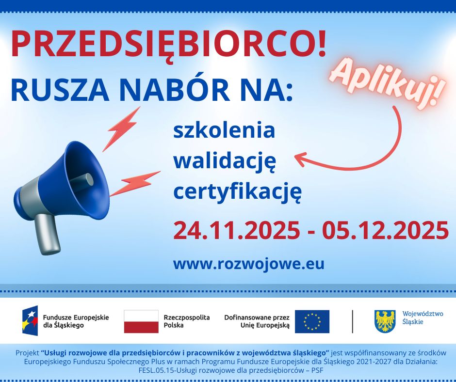 Rusza nowy nabór na szkolenia w ramach projektu „Usługi rozwojowe dla przedsiębiorców i pracowników z województwa śląskiego”. Alokacja: 1 500 000 zł, zgodnie z regulaminem naboru do projektu powiększona o 10% (tj. do kwoty 1 650 000 zł). Usługi rozwojowe możliwe do realizacji w ramach dofinansowania powinny znajdować się w katalogu usług dostępnych na stronie www.uslugirozwojowe.parp.gov.pl.
