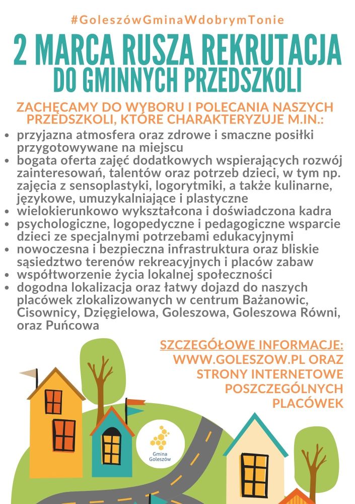 Zachęcamy do wyboru i polecania gminnych przedszkoli, które wyróżniają się przyjazną atmosferą oraz zdrowymi i smacznymi posiłkami przygotowywanymi na miejscu, bogatą ofertą zajęć dodatkowych wspierających rozwój zainteresowań, talentów i potrzeb dzieci (m.in. sensoplastyka, logorytmika, zajęcia kulinarne, językowe, umuzykalniające i plastyczne), a także doświadczoną i wszechstronnie wykształconą kadrą. Dzieci objęte są wsparciem psychologicznym, logopedycznym i pedagogicznym, szczególnie w przypadku specjalnych potrzeb edukacyjnych. Przedszkola dysponują bezpieczną infrastrukturą, położone są w bliskim sąsiedztwie terenów rekreacyjnych i placów zabaw oraz aktywnie współtworzą życie lokalnej społeczności. Dodatkowym atutem jest dogodna lokalizacja i łatwy dojazd do placówek zlokalizowanych w Bażanowicach, Cisownicy, Dzięgielowie, Goleszowie, Goleszowie Równi oraz Puńcowie.
