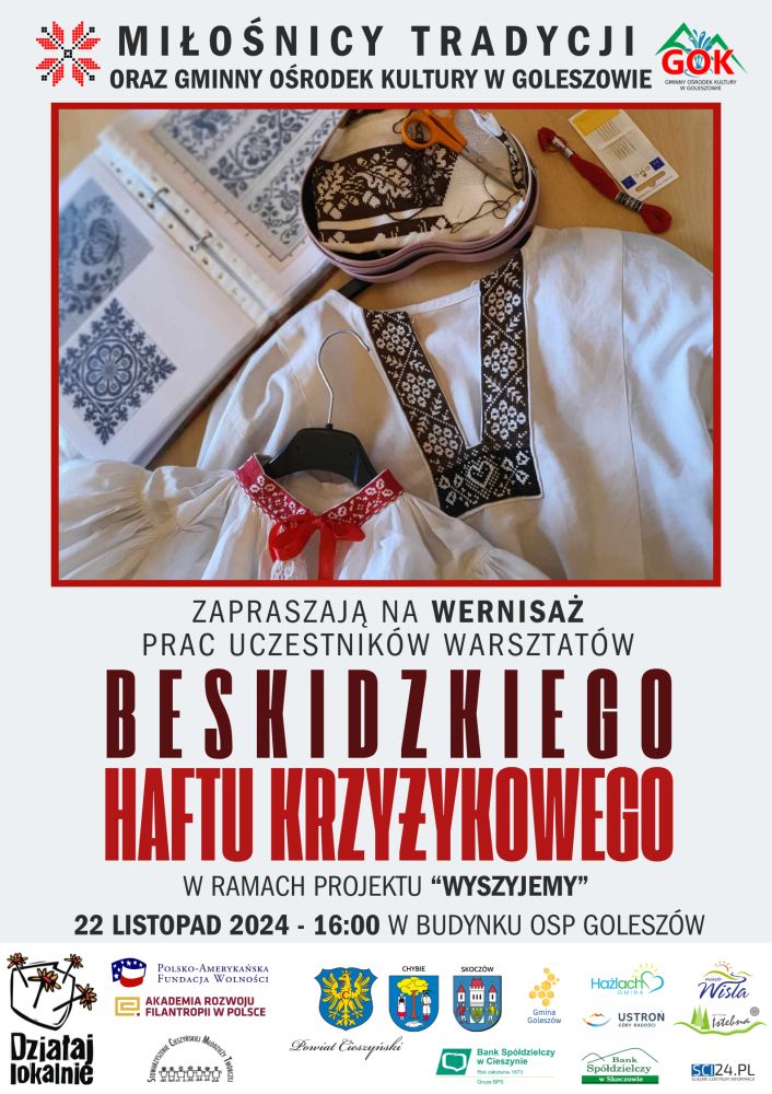• Gminny Ośrodek Kultury w Goleszowie zaprasza na wystawę podsumowującą warsztaty beskidzkiego haftu krzyżykowego, które realizowane były w ramach projektu "Wyszyjemy", dofinansowanego ze środków „Działaj Lokalnie”, a więc programu Polsko-Amerykańskiej Fundacji Wolności realizowanego z Akademia Rozwoju Filantropii w Polsce oraz Stowarzyszenie Cieszyńskiej Młodzieży Twórczej Wernisaż uczestników projektu „Wyszyjemy” odbędzie się w piątek, 22 listopada o godz. 16.00 w sali OSP w Goleszowie, a więc w tymczasowej siedzibie Gminnego Ośrodka Kultury w Goleszowie.