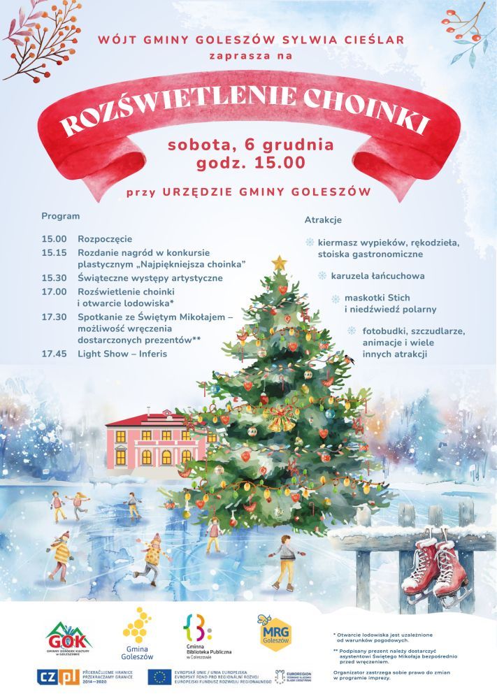 - godz. 17.00 - rozświetlenie choinki i otwarcie lodowiska (otwarcie uzależnione od warunków pogodowych)