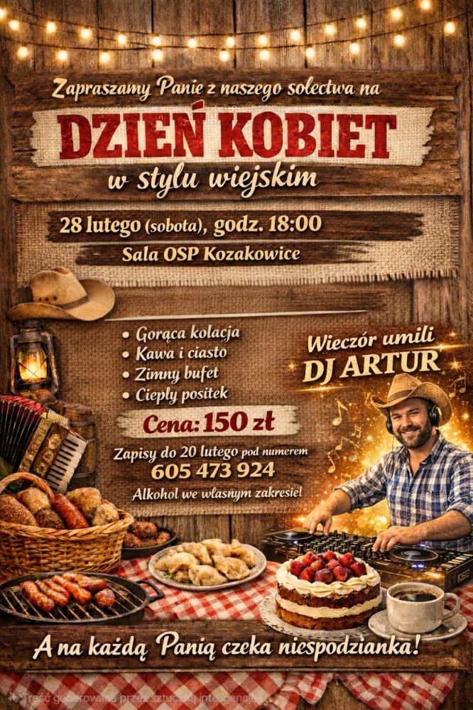 Sołtys i Rada Sołecka Kozakowic zapraszają mieszkanki Kozakowic na Dzień Kobiet w stylu wiejskim. Impreza odbędzie się w sobotę, 28 lutego od godz. 18.00 w sali Ochotniczej Straży Pożarnej w Kozakowicach. Koszt udziału: 150 zł. W cenie m.in. gorąca kolacja, kawa, ciasto, zimny bilet i ciepły posiłek, a także zabawa, o którą zadba DJ Artur. Zapisy do 20 lutego pod numerem telefonu: 605 473 924.