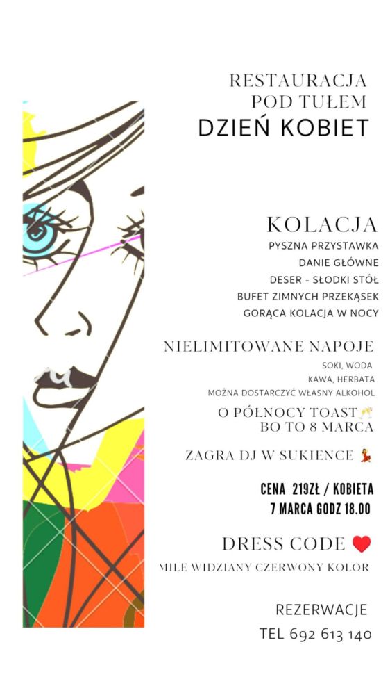 Restauracja Pod Tułem w Cisownicy zaprasza na Dzień Kobiet, a więc imprezę przygotowywaną z myślą o kobietach, która odbędzie się w sobotę, 7 marca od godz. 18.00. W programie pyszna kolacja (przystawka, danie główne, deser, bufer zimnych przekąsek oraz gorąca kolacja, a także nielimitowane napoje bezalkoholowe) oraz zabawa z DJ'em w sukience. Koszt udziału: 219 zł od kobiety. Organizatorzy zachęcają panie do udziału w wieczorze w czerwonych strojach. Dodatkowo o północy z 7 na 8 marca toast! Rezerwacje pod numerem telefonu: 692 612 140.