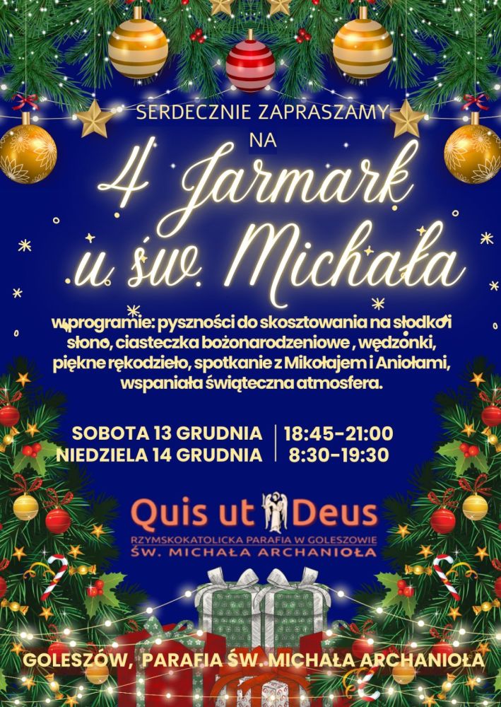 Rzymskokatolicka Parafia św. Michała Archanioła w Goleszowie zaprasza na 4. Jarmark u św. Michała, który odbędzie się w dniach 13-14 grudnia. W programie m.in. pyszności do skosztowania na słodko i słono, ciasteczka bożonarodzeniowe, wędzonki, piękne rękodzieło oraz spotkanie z Mikołajem i Aniołami. Dwudniowy jarmark odbędzie się w sobotę, 13 grudnia w godzinach od 18:45 do 21:00 oraz w niedzielę, 14 grudnia w godzinach od 8:30 do 19:30 na terenie parafii św. Michała Archanioła w Goleszowie.