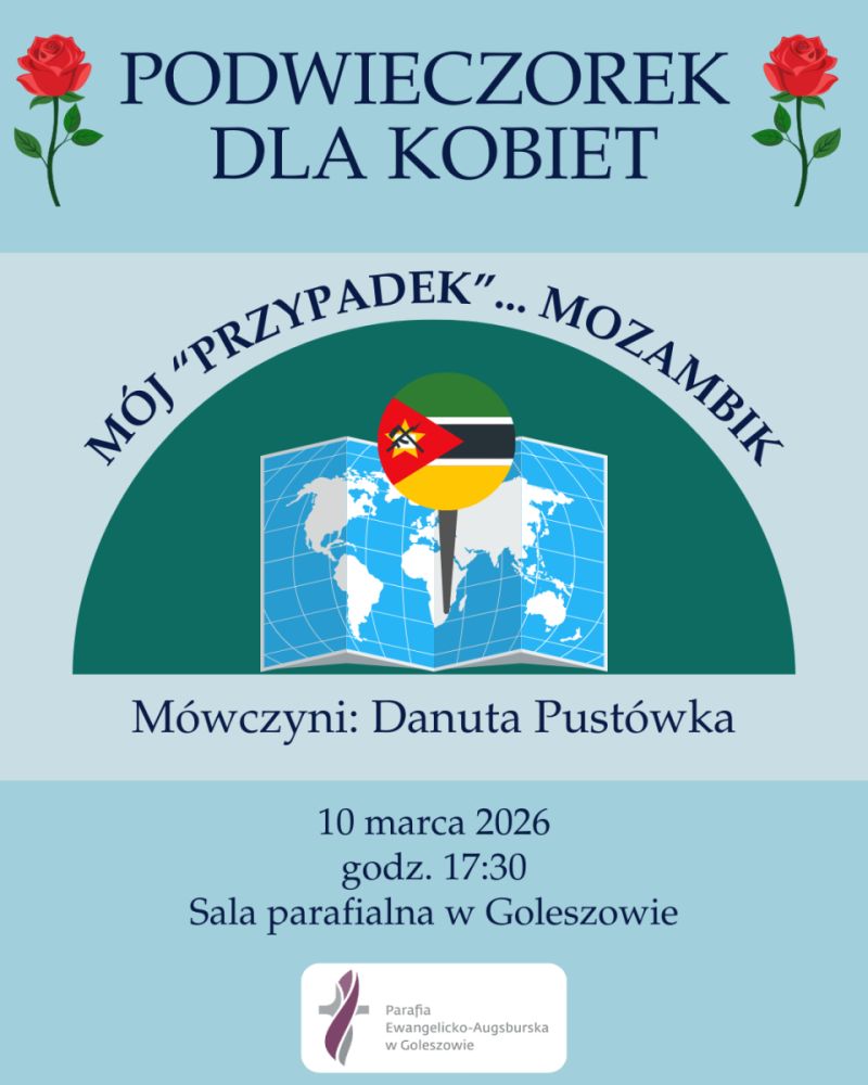 We wtorek, 10 marca o godz. 17.30 w Parafii Ewangelicko-Augsburskiej w Goleszowie odbędzie się podwieczorek dla kobiet, a więc spotkanie z misjonarką Danutą Pustówką, która opowie o swojej wyprawie misyjnej do Mozambiku. Dzień później, w środę, 11 marca o godz. 18.00 w goleszowskiej parafii ewangelickiej będzie miała miejsce kolacja dla mężyczn, w ramach której odbędą się wartościowe wykłady, nie zabraknie też śpiewu i integracji.