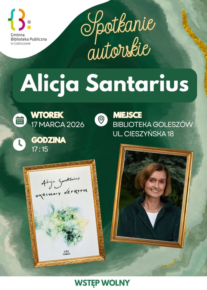 Gminna Biblioteka Publiczna w Goleszowie oraz Gmina Goleszów zapraszają na wyjątkowe spotkanie autorskie przy filiżance aromatycznej kawy i słodkim poczęstunku, które odbędzie się w kameralnej atmosferze goleszowskiej biblioteki. Gościem wydarzenia będzie Alicja Santarius – autorka książki „Okruchy Nefrytu”. Spotkanie z Czytelnikami zaplanowano na wtorek, 17 marca o godz. 17.15. Będzie to doskonała okazja do rozmowy z autorką, poznania kulis powstawania książki oraz zadania pytań dotyczących jej twórczości. Najnowsza powieść Alicji Santarius to opowieść obyczajowo-sentymentalna, gdzie proza życia przeplata się ze sztuką. Głównych bohaterów łączą godziny rozmów o życiu, marzeniach i różnice dotyczące możliwości ich realizacji w dorosłym świecie, ponadto las, rzeka i pewien zielony kamień. Serdecznie zapraszamy wszystkich miłośników literatury na inspirujące spotkanie. Wstęp wolny.