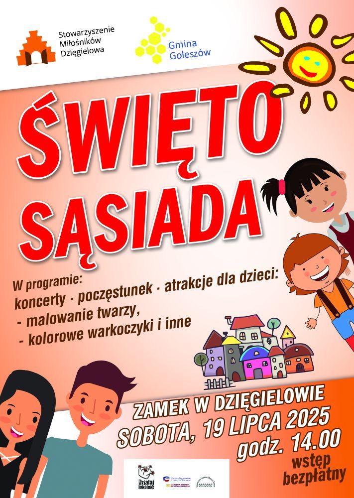 Stowarzyszenie Miłośników Dzięgielowa oraz Gmina Goleszów zapraszają na kolejną odsłonę "Święta Sąsiada", które odbędzie się w sobotę, 19 lipca na terenie Zamku w Dzięgielowie. Początek imprezy o godz. 14.00. W programie koncerty i występy artystyczne, poczęstunek - w tym wspólne pieczenie kiełbasek. Na najmłodszych czekać będą liczne atrakcje i animacje w tym m.in. malowanie twarzy, kolorowe warkoczyki. Wstęp wolny. Impreza towarzyszy Plenerowi Rzeźbiarskiemu, a dokładnie jego podsumowaniu i prezentacji dzieł powstałych w ramach transgranicznej, polsko-czeskiej imprezy.