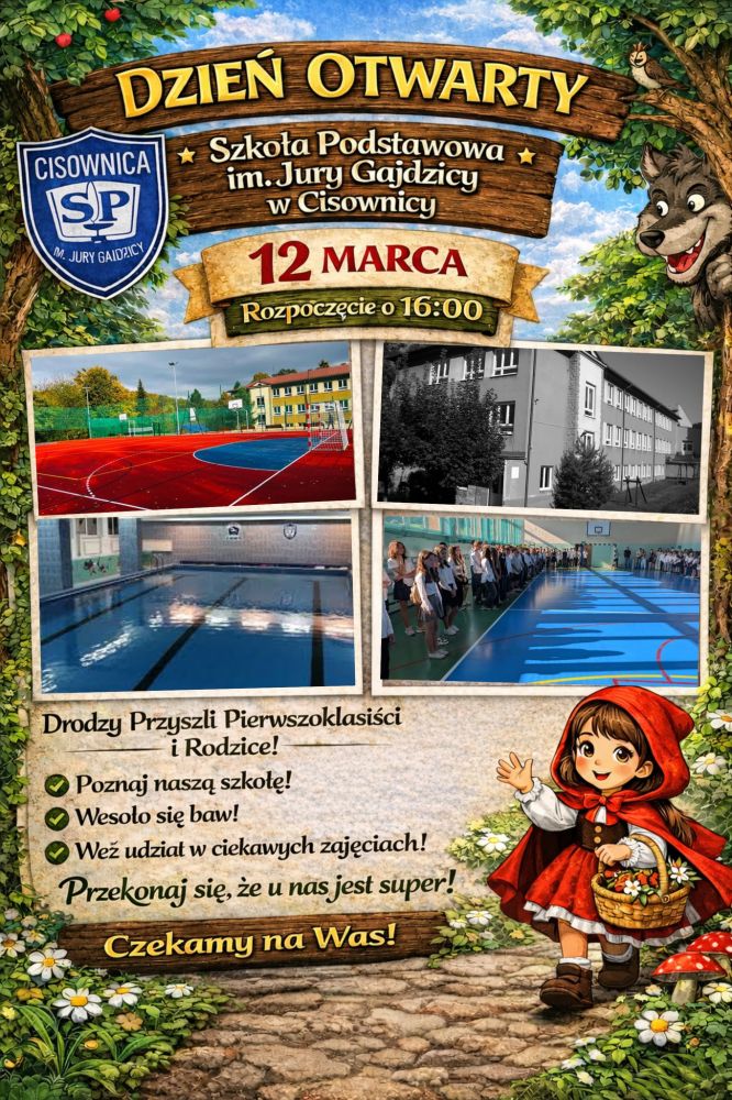 Szkoła Podstawowa im. Jury Gajdzicy w Cisownicy oraz Gmina Goleszów serdecznie zapraszają na Dzień Otwarty, który odbędzie się w czwartek, 12 marca o godz. 16:00. To wyjątkowe wydarzenie skierowane jest do przyszłych Pierwszoklasistów oraz ich Rodziców, którzy chcieliby bliżej poznać szkołę, jej ofertę edukacyjną oraz atmosferę codziennego życia uczniów!